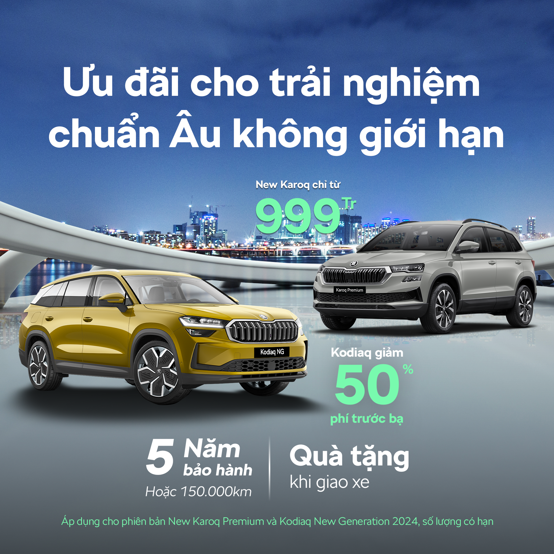 - Sở hữu Kodiaq New Generation với mức ưu đãi giảm 50% phí trước bạ (áp dụng cho phiên bản Kodiaq NG 2024)