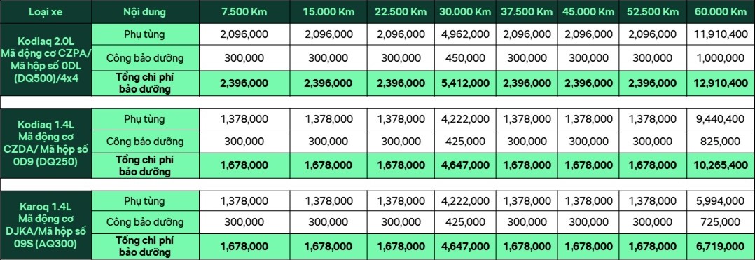 Hiện tại, chi phí bảo dưỡng ước tính của Skoda như sau: